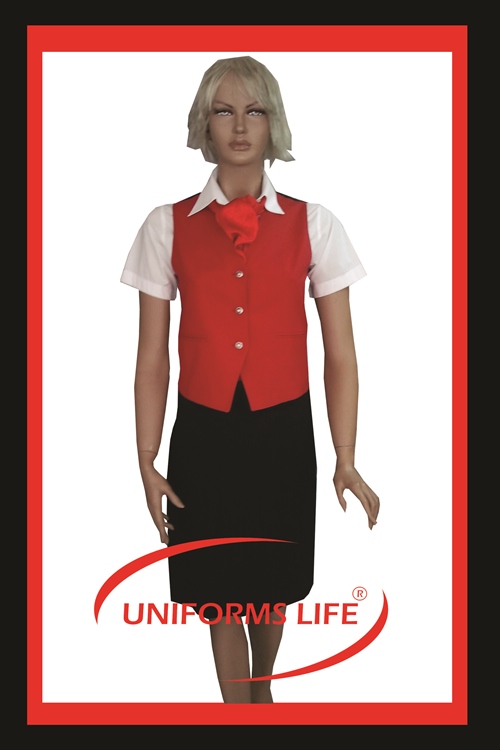 KIRMIZI GABARDİN KUMAŞTAN METAL DÜĞMELİ YELEK SİYAH GABARDİN KUMAŞTAN ETEK