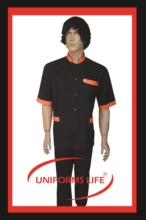 KISA KOLLU SİYAH ALPAKA KUMAŞTAN YAPILMIŞ HOUSEKEEPİNG KIYAFETİMİZ TURUNCU İLE HARMANLANIP SİYAH ALPAKA KUMAŞTAN PANTOLON İLE KOMBİNLENEREK SİZLERİN BEĞENİSİNE SUNULMUŞTUR
